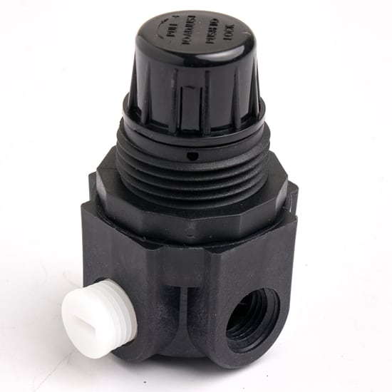 Panel mountable air regulator. Diaphragm operation rated at 25 SCFM. Set pressure range of 0-125 PSI. Nylon body with 1 in and 3 out 1/4" NPT ports. Compact size at 2-3/4" high x 1-1/2" wide.