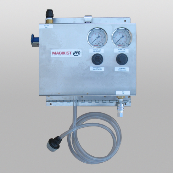 Two bay air pump presoak system. Wall mount stainless steel panel with air pump for consistent product delivery. Separate regulator and gauges for pump and outlet air pressure. Push to connect outlet fittings. Includes bay connection fittings with check valves and foam generators. Can be used for tire clean or engine clean as well. Metering valve connection for provide weep. Use with FBPA1-MIX to control and dilute presoak chemical. Requires 24 VAC.